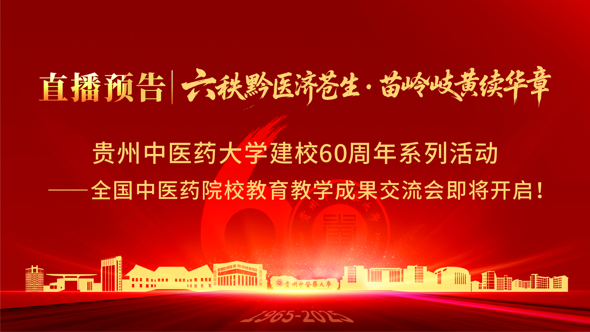 贵州中医药大学建校60周年系列活动——全国中医药院校教育教学成果交流会即将开启!直播时间:2025年9月27日(周六)上午9:00直播地点:贵州中医药大学花溪校区北区体育馆直播入口:https://yledwgvzb.vzan.com/v3/course/alive/336352259?shauid=PrplQmr66fD_PDvKcSOreg**&sharetstamp=1758805714027&v=1758852264037 六十载薪火相传,守正创新育英才;新时代聚力前行,共筑中医新辉煌!9月27日上午9:00,让我们云端相聚,共赴...