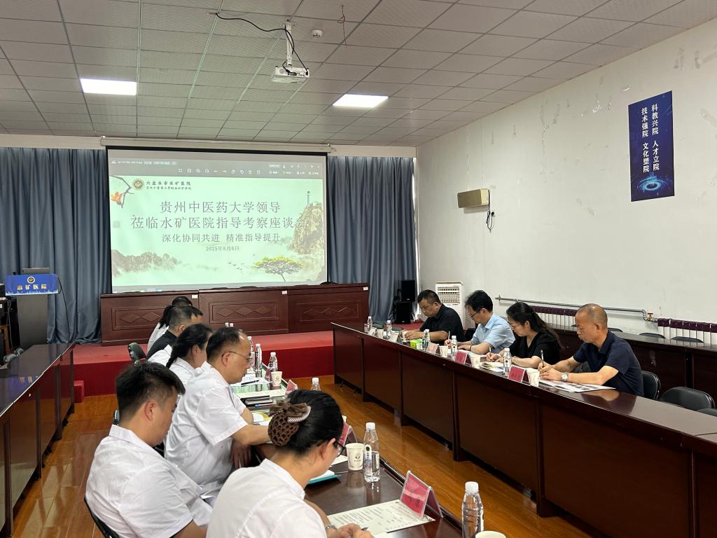 在六盘水市水矿集团总医院,医院管理委员会主任周鹏、院党委书记胡兆国、院长房体刚详细介绍了医院教学体系、科研平台、人才队伍建设等情况,并就我校实习生临床实习带教、住宿、就餐、临床技能实训等情况作了进一步介绍。双方就实习计划执行、带教师资培训、学生管理等进行了具体对接。