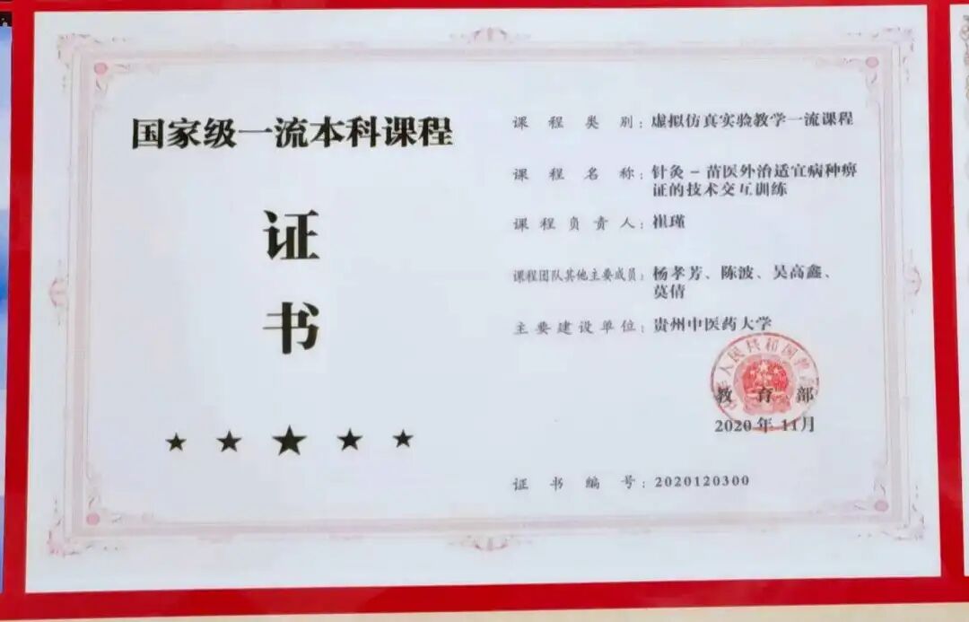 学院现有针灸推拿学博士、硕士、学士学位授权点,中医康复学和康复治疗学学士学位授权点。教育部特色专业建设点1个,贵州省一流专业2个、贵州省示范专业1个;国家级一流课程(虚拟仿真项目)1门,国家级双语课程1门;省级一流课程2门,省级金课11门,省级精品课程2门;省级一流平台1个;国家名老中医工作室1个;贵州省中医(民族医)高级人才培养基地1个,贵州省普通高等学校针灸推拿学特色重点实验室1个,贵州省针灸推拿实验教学示范中心1个,贵州省专业实验室1个,贵州省大学生创新创业训练中心1个;贵州省教学团队1个。