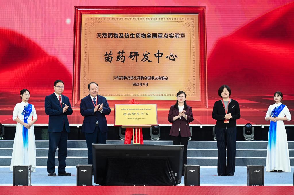 在揭牌、签约、捐赠仪式环节,天然药物及仿生药物全国重点实验室主任周德敏教授、副主任宋书香教授为北京大学在我校挂牌成立的“天然药物及仿生药物全国重点实验室苗药研发中心”揭牌。学校分别与贵州省旅游产业发展集团有限公司、中国农业银行贵州省分行、中国银行贵州省分行签署合作协议。国药集团同济堂(贵州)制药有限公司副总经理、国药大健康董事长鄢云,广东一方制药有限公司湘黔大区经理张杰,四川新绿色药业科技发展有限公司贵州总监赵志伟,中黔电气集团董事长陈律宇,药学院2005级校友、陕西医之云智能科技有限公司董事长长孙永济向学校捐资;学校为深圳苗艾有限公司总经理彭恩国,中医系80级(1)班校友李应颁发捐赠收藏证书。